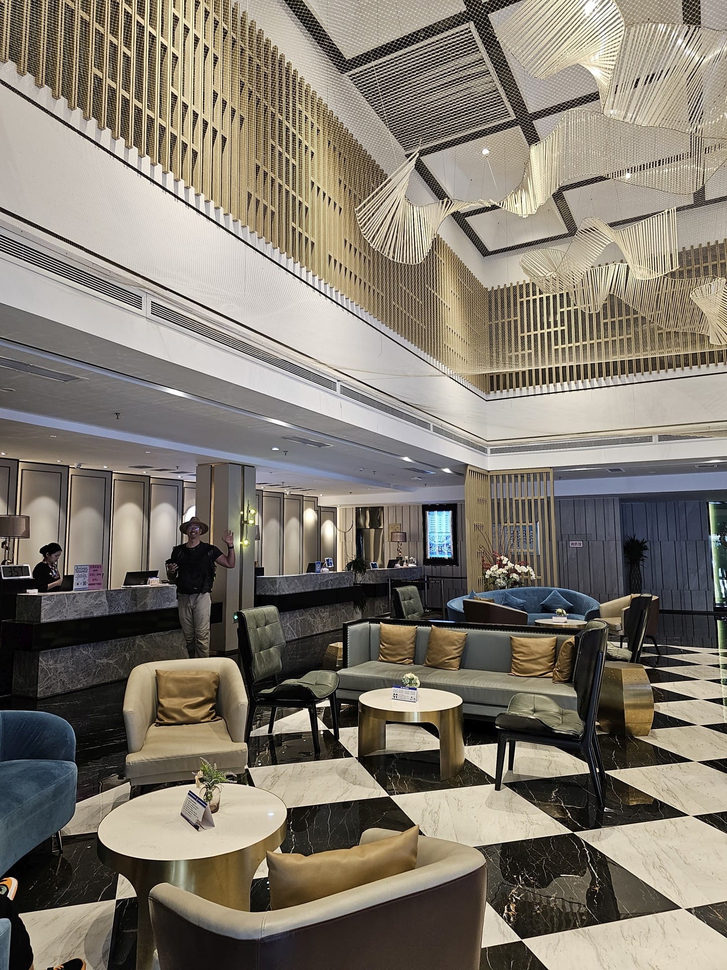 Pri vychádzaní zo stanice musíme opäť k živému pajkovi, nech nás s našimi pasmi vypustí. Hotel má byť niekde oproti stanici, no zase ho nevieme nájsť. Nakoniec sa pýtam v obchodíku a ukážu nám nápis, na boku budovy. Je to hotel, ktorý má spredu úplne iný názov. Máme naozajstné veľké lobby a po checkine nás odvedú až ku výťahu, z ktorého vylezie robot a niečo pri tom vykladá po čínsky.