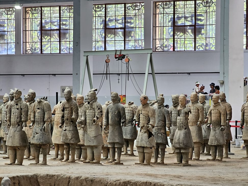 Všetko nasvedčuje tomu, že vykopali veľkú jamu, tam naskladali do radov armádu vojakov z hliny v životnej veľkosti a potom tie rady oddelené múrmi pozakrývali a zasypali. V oblasti je aj hrobka panovníka Qin Shi Huang (prvý cisár a zjednotiteľ Číny), o ktorej je mnoho dokumentov, ako napríklad, že je naplnená ortuťou, no o armáde nie je nikde žiadna zmienka. Asi to malo byť tajné. Armádu náhodou vykopal roľník v 1974 pri kopaní studne. Hrobka panovníka doteraz nie je otvorená, čakajú, kým sa ortuť nadobro vyparí.