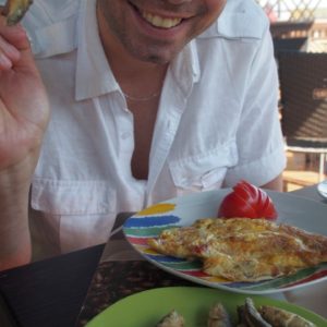 Na večer už potrebujeme elektriku, tak ideme na pizzu do centra. Vonku na teraske ešte ako tak prefukuje a pri pizzi je fajn, vnútri je ale iba jedna jediná zástrčka a milióny nadržaných komárov. Tak toho moc veľa nenabijeme a zdrháme spať.