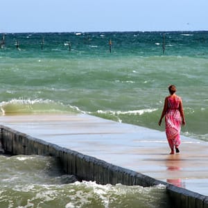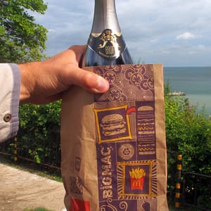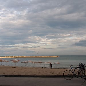 Po obede vyrazíme do prímorského parku. Cestou sa zastavíme v McDonalde, že niečo na zajedenie ku sektu. K naháňa obrazy z detstva. V Konstante si nič nevybavila, no tu aspoň uhádla miesto kde bývali a jedli. Počasie je také kadejaké, výhľady z parku na more väčšinou zarastené. Prejdeme okolo detí, čo spievajú tak falošne známe hity, že tam vydržíme sedieť ani nie dve minúty. Nakoniec si ale nájdeme pekný výhľad, prenesieme do neho lavičku a pozorujeme čajky. Tie vedia robiť taký zvuk detského plaču, že som si na to už navykol a bol až prekvapený keď som videl naozajstné dieťa revať. Keď sa ako tak vypeknilo zišli sme schodmi – ktorými zrejme kedysi K chodila – dole ku plážam a zapadli do prvého podniku na rybičky. Tu sa ančovičky volajú caca. Majú tu aj štyri malé hravé mačiatka. Pláž celkom smrdí, lebo búrka vyplavila na breh kopu zelených rias. Podvečer to ale niekto začne zbierať. Tak sme prekvapení, že to tu s tou plážu asi myslia vážne.
