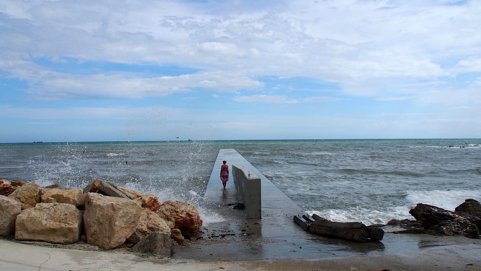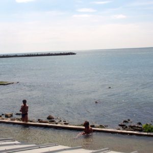 Vyrazíme do drobného mrholenia, že si pozrieme zvyšok pláže. Hneď pár krokov od nášho podniku – Rusalka – zbadám obláčik pary nad morom. Ideme sa tam pozrieť a K si spomenie, Že sú tu vlastne termálne pramene. Vidíme sprchy na brehu mora a kúsok ďalej je bazén z ktorého sa parí. Je v ňom pár ľudí i keď je už tma. Celé to vyzerá bezplatne. Zajtra by sme mohli dobehnúť sa trochu prehriať.